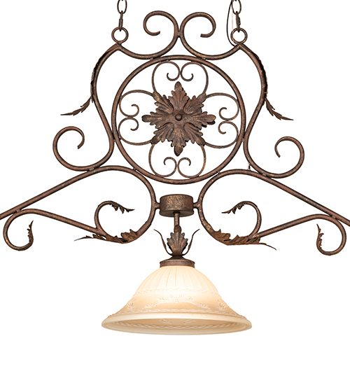 Enjoy the romance and elegance of this oblong billiard pendant which is adorned with 3 White blown-glass, dome shaped shades, which are embraced by scrolled arms and decorative accents. An abstract floral medallion distinguishes the center of this exquisite lighting design, which is featured in a Cortez Gold finish. Custom crafted in the Yorkville, New York manufacturing facility, this fixture is perfect for illuminating billiard tables, islands, counters and bars. It is offered in custom sizes, colors and styles, as well as dimmable energy efficient lamping options such as LED. This custom pendant is UL and cUL listed for damp and dry locations.