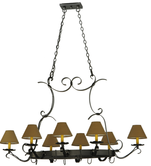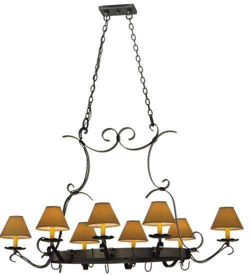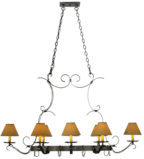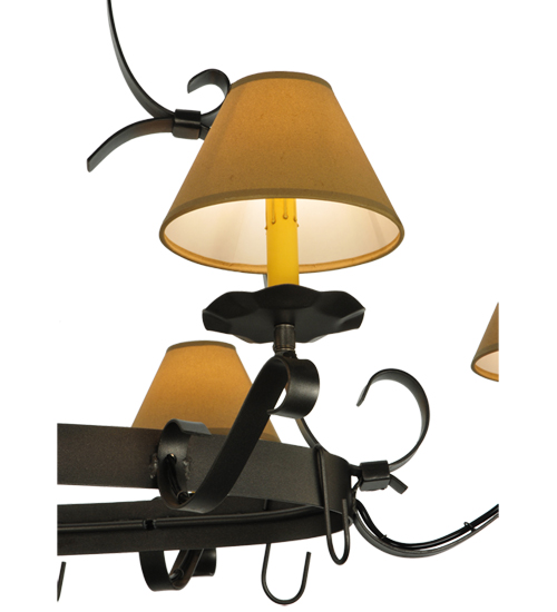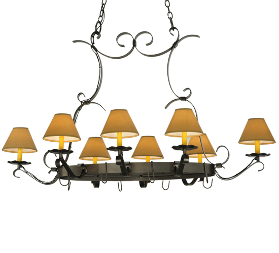 A handsome chandelier that doubles a lighted pot rack. Laramie features a sturdy frame with a stunning Blackened Pewter finish. 8 Ivory faux candlelights are crowned with Alabaster Textrene Shades supported by bobeches while providing ambient illumination. Designed with hooks to display fine cookware in a culinary space. Overall height ranges from 41 to 93 inches as the chain length can be easily adjusted in the field. Handcrafted in our 180,000 sq ft manufacturing facility in Yorkville, NY. Shade colors, metal finishes and fixture sizes can be customized to your needs. UL and cUL listed for dry and damp locations however we do not recommend installing it in spaces that experience a large amount of moisture due to the fabric shades. (Cookware not included)