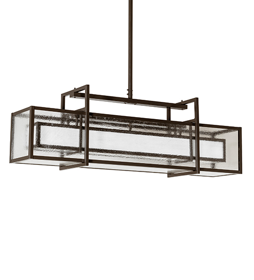 A sleek architectural structure in light. The Nelson oblong pendant is designed with a Clear Seeded Glass shade, which surrounds a smaller White Glass oblong diffuser. The fixture is complemented by an elaborately structured frame featured in a Timeless Bronze. The oblong fixture is ideal for illuminating billiard tables, kitchen islands, counters, bars, reception areas, and other spaces from Boston, Massachusetts, to Houston, Texas. The Nelson Oblong Pendant is included in our American-made, American-designed Modern Architectural Collection and manufactured in Yorkville, NY. It is UL and cUL listed for dry and damp locations.