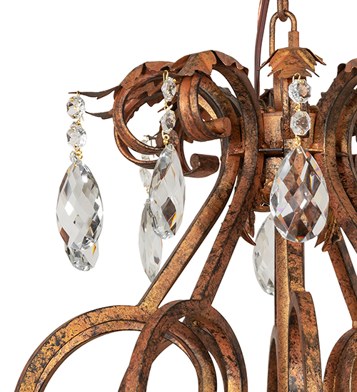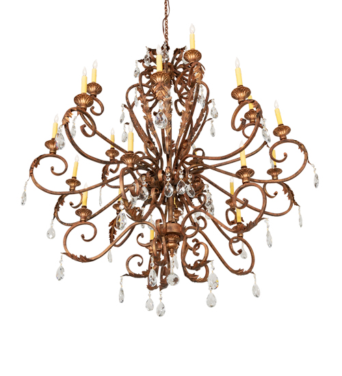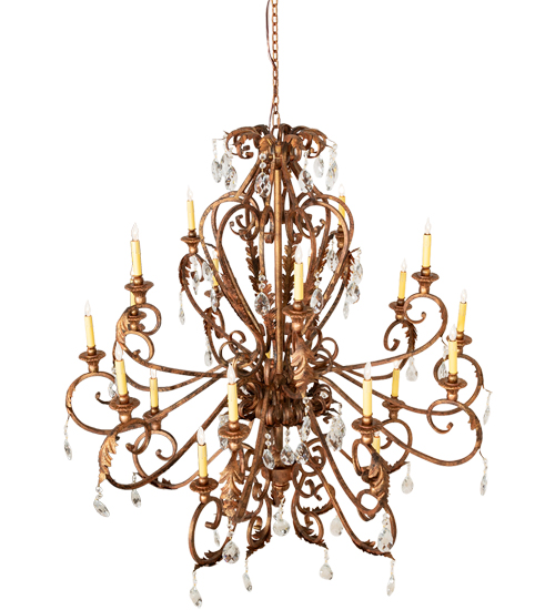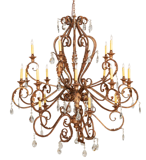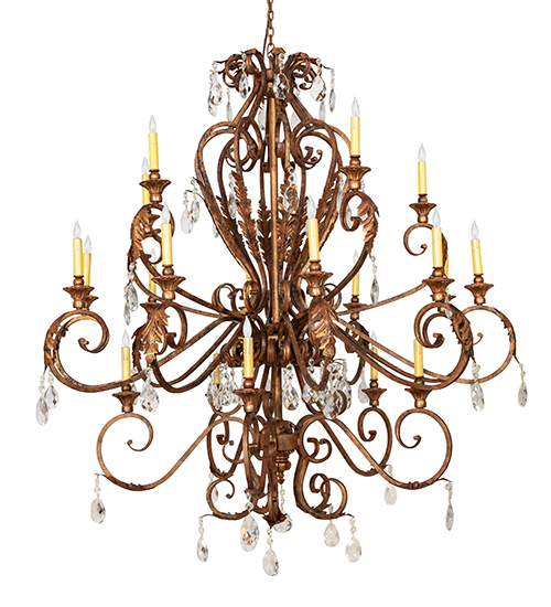 Unsurpassed elegance, grace, and beauty are defined by this large Serratina Chandelier. The fixture features shapely curves in an exquisite Autumn Leaf finish. Serratina offers a lustrous symphony of Hand-Forged Iron Scrollwork, Crystal Pendalogs and Garlands, accented with metal Acanthus Leaves throughout. Twenty delicate Ivory faux candlelights create beautiful ambient illumination in entryways and living spaces in fine homes and resorts from Cincinnati, Ohio, to Jacksonville, Florida, to Plano, Texas. The overall height of this pendant ranges from 62 to 170 inches, as the chain length can be easily adjusted in the field to accommodate your specific lighting application needs. The Serratina Chandelier is included in our American-made, American-designed, handcrafted Crystal Lighting Collection, which is manufactured in Yorkville, New York. UL & cUL listed for dry and damp locations.