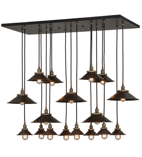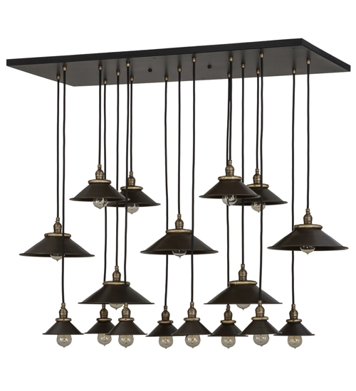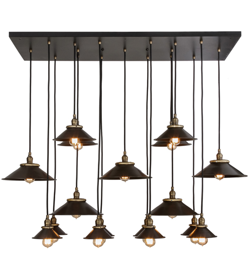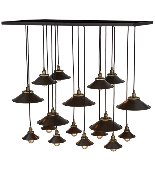 Industrial utilitarian mult-light pendants are offered with a modern flair. Steel and Brass diffusers are offered with hardware finished in a Solar Black powdercot, Timeless Bronze and Antique Brass. Custom crafted in the USA, this fixture is available with custom designs, colors, and sizes, as well as dimmable energy efficient lamping options such as LED. The 54-inch wide fixture is UL and cUL listed for damp and dry locations.