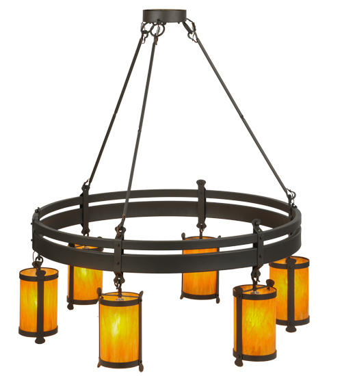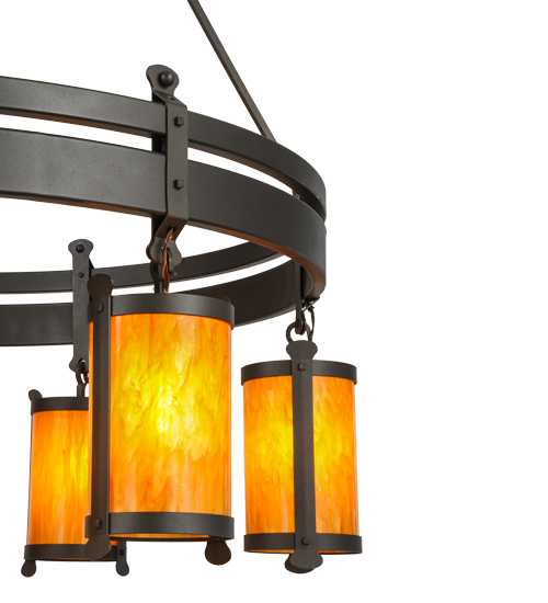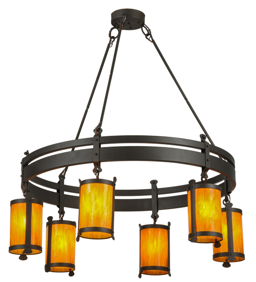Integrating an elegant style with a classic distinguished look, Beartooth is custom crafted with 6 Ambra Siena Idalight Cylindres perched on a rugged, double-circular frame, which is featured in a Wrought Iron finish. Each luminaire is adorned with Beartooth-like, vertical metal accents in a matching finish. The chandelieris handcrafted by skilled artisans at the foothills of the Adirondack Mountains. Custom colors, styles and sizes are available, as well as dimmable energy efficient lamping options such as LED. The fixture is UL and cUL listed for damp and dry locations.