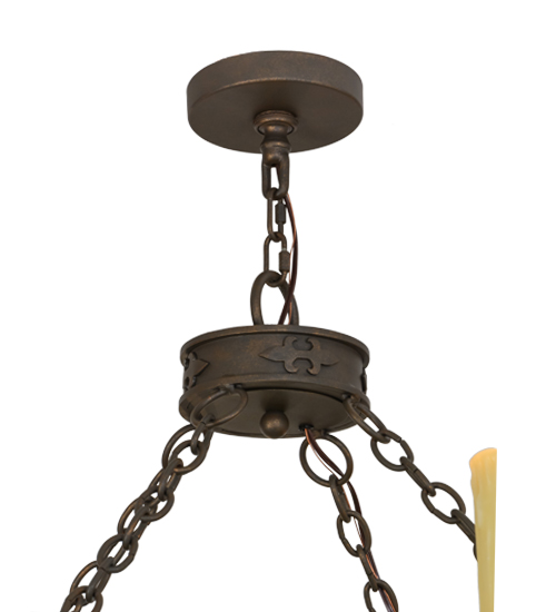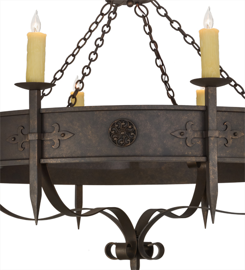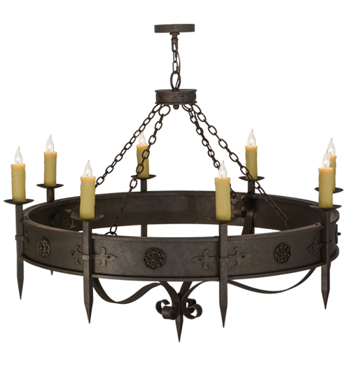 Calandra brings together a luxurious charm and a rich artistic look. Floral medallions and other decorative motifs accentuate this stunning steel chandelier featuring 8 exquisite Amber faux candlelights perched on bobeches. The fixture is enhanced with sturdy, detailed hardware and a scrolled finial featured in a handsome Gilded Tobacco finish. The fixture is ideal for entryways, dining areas, lobbies, ballrooms and other rooms in a variety of residential and commercial settings. Handcrafted by our artisans in our 180,000 square foot manufacturing facility in Yorkville, New York, in the USA. Options include dimmable energy efficient lamping such as LED, as well as custom sizes, styles and colors. UL and cUL listed for damp and dry locations.