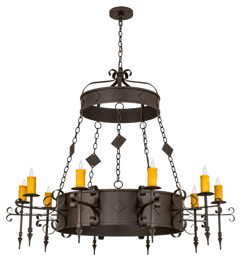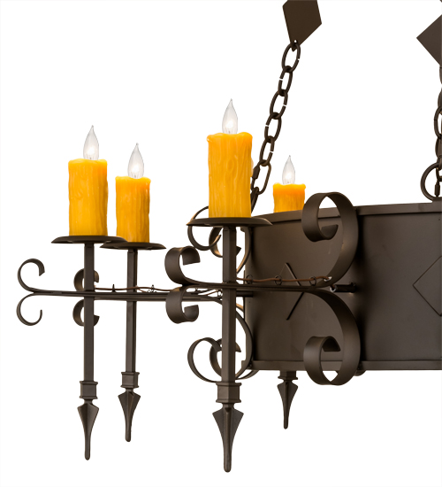 Welcome Gothic Revival into your home or business with the stunning Diamante Chandelier, which integrates a rustic motif with old world style. 10 Amber faux candles perched atop bobeches embraced by a single decorative ring provide ambient lighting that conjures up images of romanticized days of yore. Decorated with scroll accents, pointed tips and featured in an Oil Rubbed Bronze finish, it completes an evocative impression for a stunning custom wrought iron look. Custom crafted in Yorkville, New York our skilled artisans, this fixture is offered in in custom designs, sizes and finishes, as well as dimmable energy efficient lamping options such as LED.