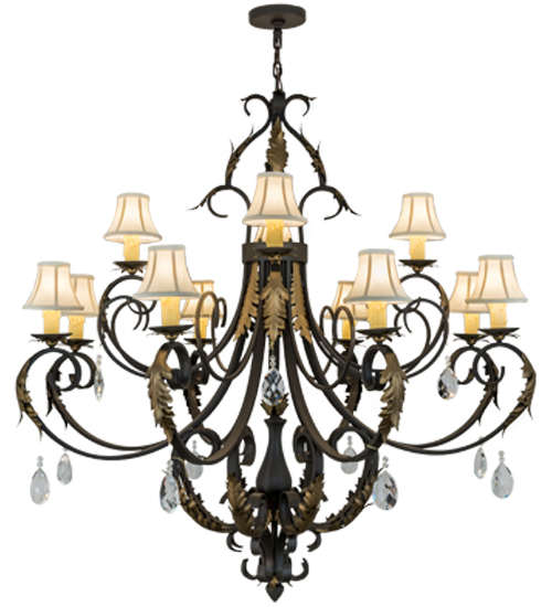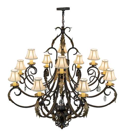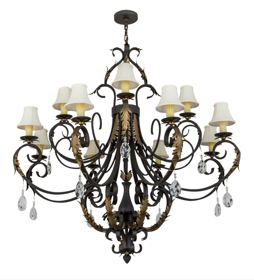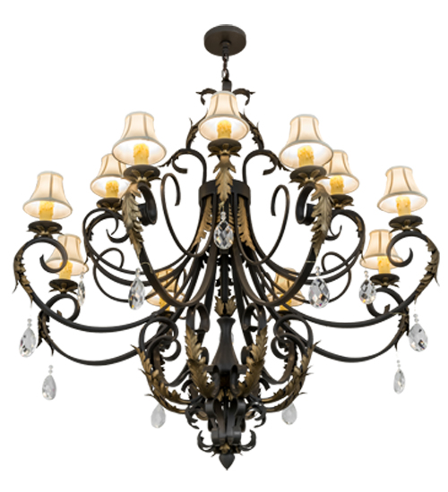 An elegant chandelier design comes to light with sophistication and distinction. 12 Faux Amber candlelights topped with Cream Textrene Trumpet shades are perched on bobeches, which are embraced by exquisite scrolled arms featured in a Timeless Bronze finish. The fixture is complemented with Gold Metallic finished Acanthus Leaf accents and an array of crystal pendalogues. Handcrafted in our facility in Yorkville, New York, this chandelier is available in custom sizes, styles, colors and dimmable energy efficient lamping options including LED. The fixture is UL and cUL listed for dry and damp locations.