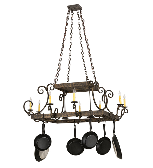An upscale lighted pot rack design. Caiden is highlighted with Hand-Forged Iron Scrollwork and a Golden Bronze finished frame with hooks to display fine cookware or accessories for easy access in kitchens. Eight Ivory faux candlelights provide beautiful ambient illumination while two customer-supplied downlights deliver functional lighting on surfaces below. The overall height ranges from 27 to 94 inches as the chain length can be easily adjusted in the field to accommodate your specific lighting application needs. Candlelight colors, metal finishes and fixture sizes can be customized. UL and cUL listed for dry and damp locations. (Cookware not included)