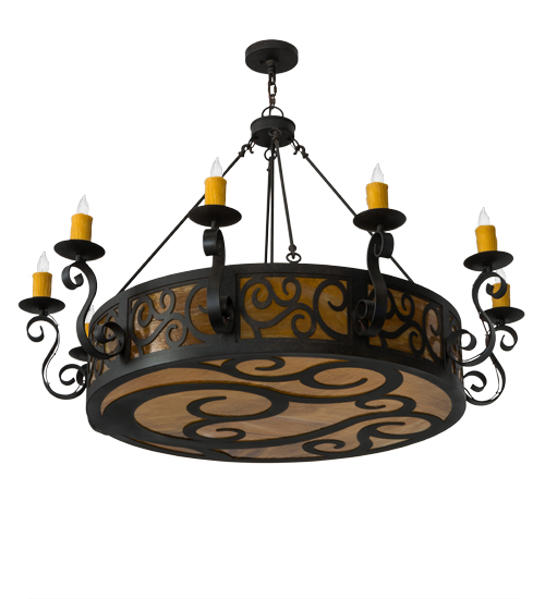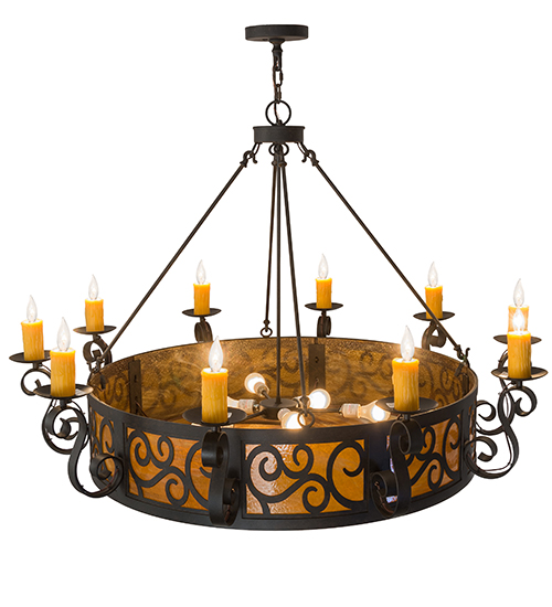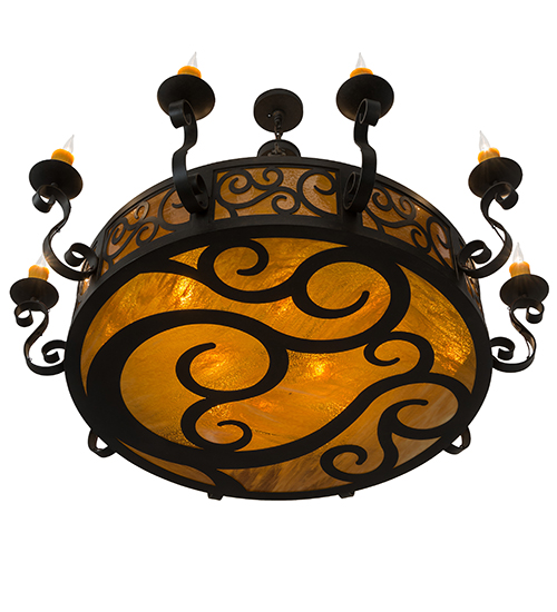 The Delano chandelier offers a lovely elegant style. This chandelier is enhanced with decorative accents and hardware featured in a stunning Chestnut Textured finish. The fixture integrates a Honey art glass diffuser with sparkling illumination emanating from 10 Amber faux candlelights perched on bobeches embraced by Hand-Forged Iron Scroll styled arms. The overall height ranges from 44 to 140 inches as the chain length can be easily adjusted in the field to accommodate your specific lighting application needs. Handcrafted by highly skilled artisans in our 180,000 square manufacturing facility in Yorkville, New York. Custom diffuser styles, metal finishes and fixtures sizes can be customized to meet your needs. UL and cUL listed for damp and dry locations.