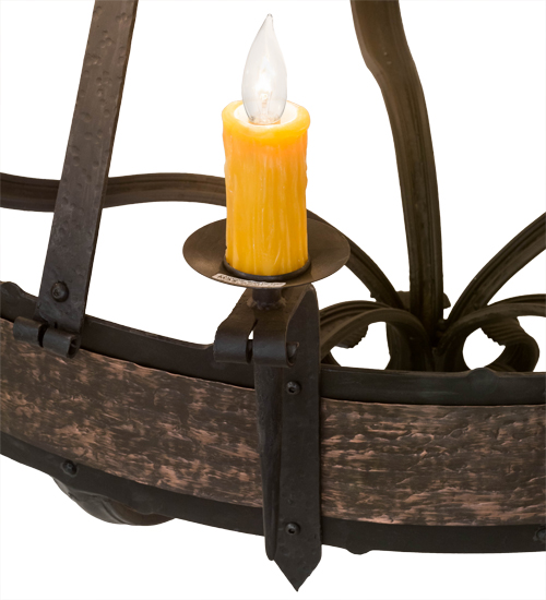 Two tiers are embellished with steel bands featured in a Blackened Copper finish and complemented with hardware in a Costello Black finish. 20 Faux Amber candelights, featuring 10 on each tier, are perched on bobeches and provide beautiful ambient lighting. Individually handcrafted in Yorkville, New York by highly skilled artisans, this chandelier is available in custom sizes, finishes and designs as well as dimmable energy efficient lamping options. The fixture is UL and cUL listed for damp and dry locations.