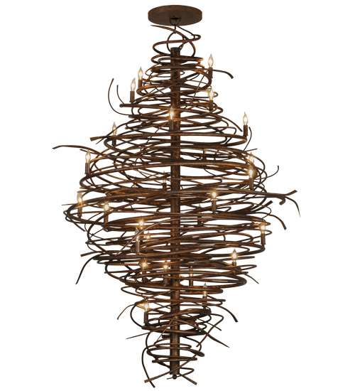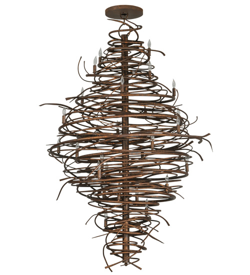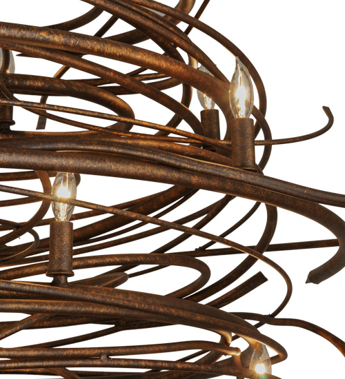 The bold, eye-catching Cyclone simulates whirling winds of energy and gyration with twisting steel that is accentuated with 28 delicately placed beacons to help you weather the storm. The winding mass of steel surrounds a sturdy post, all featured in our Antique Rust finish. Make an impressive design statement that will wow guests in lobbies, conference rooms, entryways and other residential and commercial spaces. The fixture is handcrafted by master artisans in our Upstate New York manufacturing facility. Custom designs, styles, sizes and dimmable energy efficient lamping such as LEDs are available. This chandelier is UL and cUL listed for damp and dry locations.
