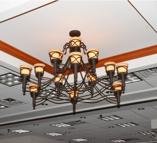 An impressive ensemble of illuminated torches. This Grand Aspen Chandelier features 15 Cream Scavo Glass shades with sturdy bases and filigree accents. The sprawling curved frame and hardware are featured in a Timeless Bronze finish. Handcrafted by highly skilled artisans in our 180,000 square foot manufacturing facility in Yorkville, New York. Available in a wide range of custom choices including various finishes, shade colors and sizes. UL and cUL listed for dry and damp locations.