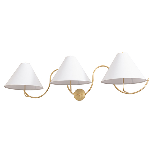 Inspired by the curved swooping of sound waves, this unique wall sconce features a beautifully Brushed Brass profile. The three sophisticated shades feature an elegant White Linen for a Chic modern touch. The Solid Brass wall luminaire is ideal for illuminating hallways and dining areas in residential and hospitality spaces. The Soundwave 3 Light Wall Sconce is included in our American-made, American-designed, handcrafted Modern Lighting Collection, and it is manufactured in Yorkville, New York. It is UL and cUL listed for dry and damp locations; however, we do not recommend installing it in spaces that experience excessive moisture due to the fabric shade.