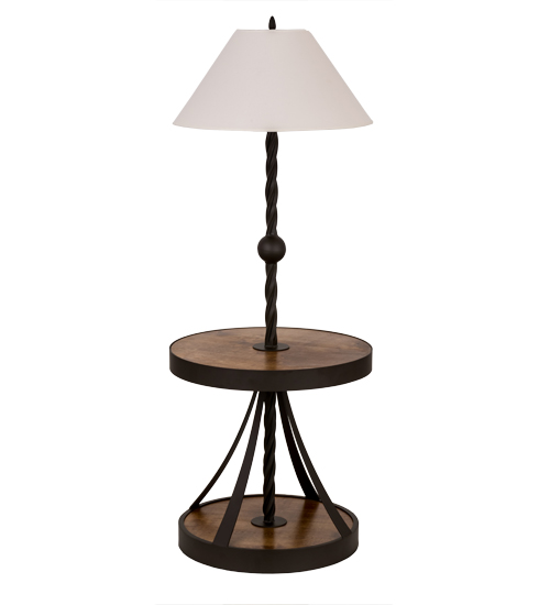 This unique floor lamp highlights a Beige Textrene shade that crowns a rope-like Oil Rubbed Bronze base featuring an orb-shaped accent and two round wooden pedestals with a Dark Walnut Stained finish. Handcrafted by highly skilled artisans in the USA. Custom designs, finishes and sizes are available, as well as dimmable energy efficient lamping options including LED. The floor lamp is UL and cUL listed for dry locations.