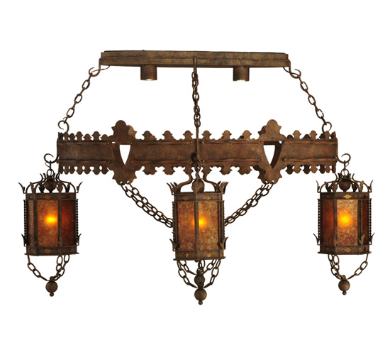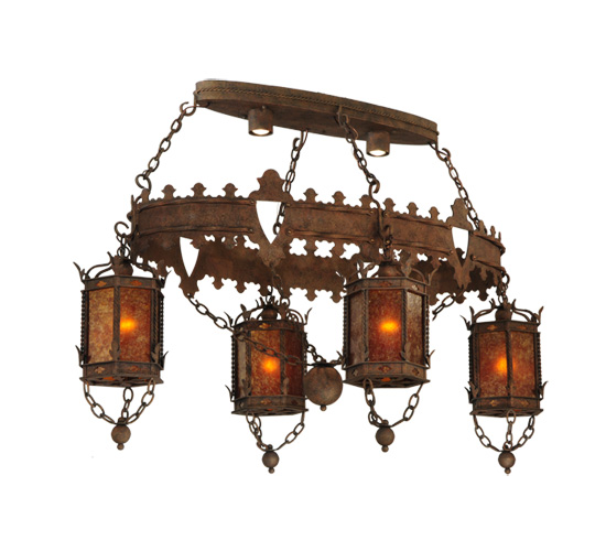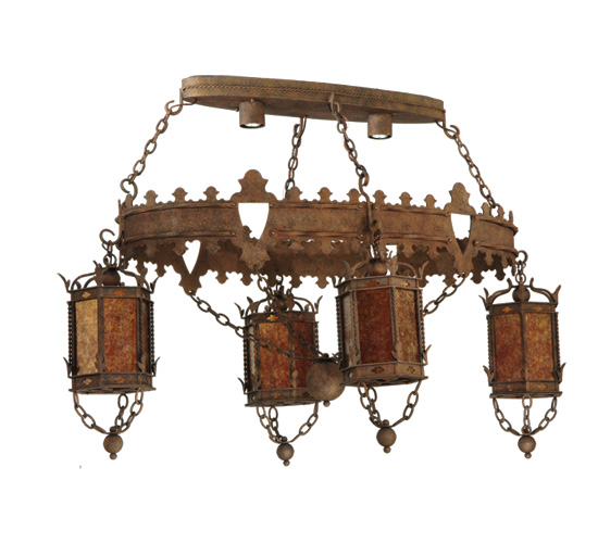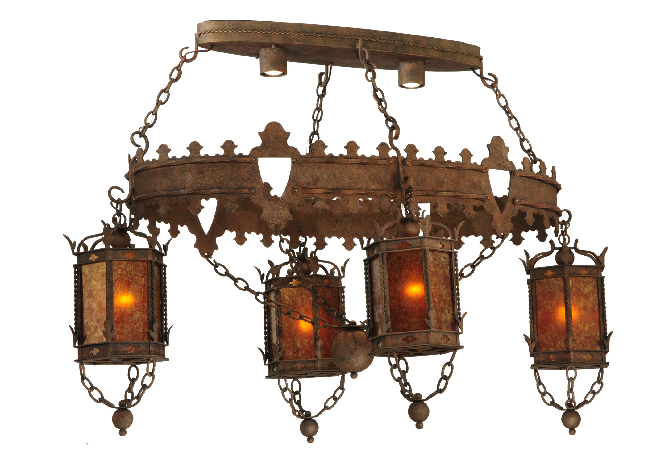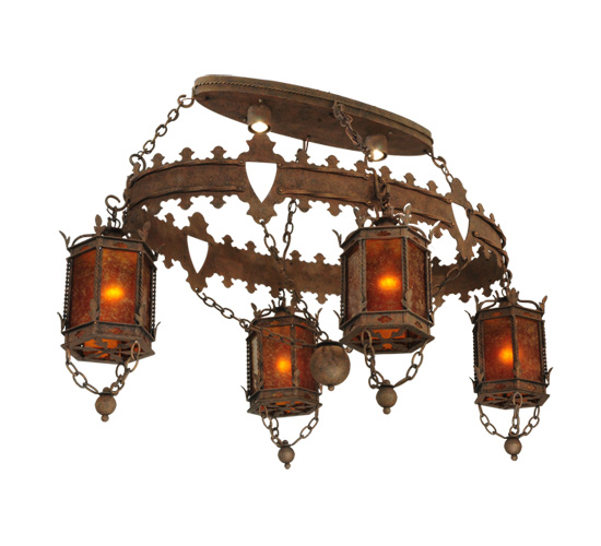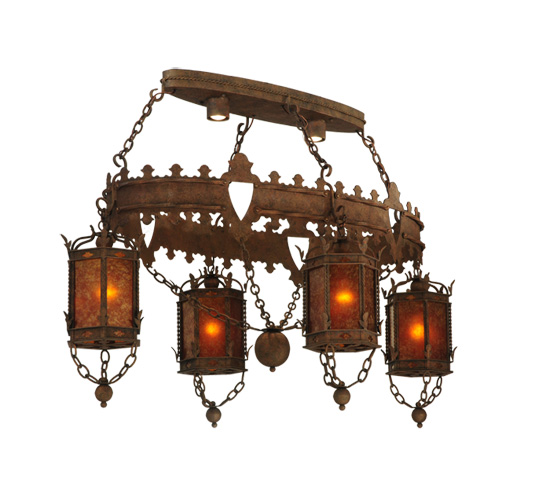 An elaborate chandelier that incorporates a unique Gothic design and beckons with light. Valhalla features four decorative lanterns that reveal Amber Mica diffusers which are complemented with a Roccoco finish. The impressive decorative ring and shade frames, shown in a matching finish, are embellished with decorative accents and shield medallions. Ideal for illuminating islands, counter bars and tables. Handcrafted by master artisans in our 180,000 square foot manufacturing facility in Yorkville, New York. Lantern colors, metal finishes and fixture sizes can be customized to meet your needs. UL and cUL listed for damp and dry locations.