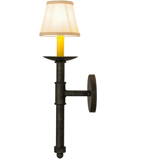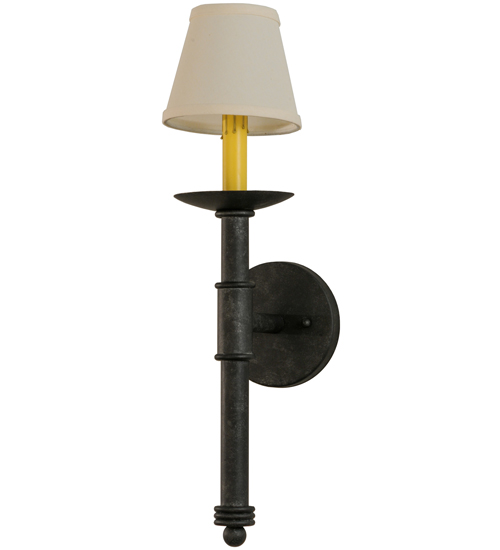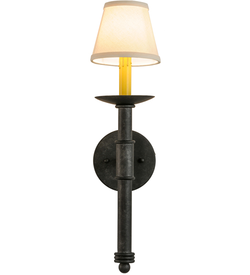 Designed as a dramatic accent for any room or corridor. The Amada wall sconce features a Natural Textrene shade perched on an Amber faux candlelight and bobeche with telescopic styled accents. This fixture features a Smoke finish. Custom crafted by highly skilled artisans in our 180,000 square foot manufacturing facility in Yorkville, New York. Custom colors, styles and sizes are available, as well as dimmable energy efficient lamping options. UL and cUL listed for dry and damp locations however we do not recommend installing it in spaces that experience a large amount of moisture due to the fabric shade.
