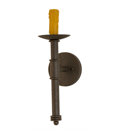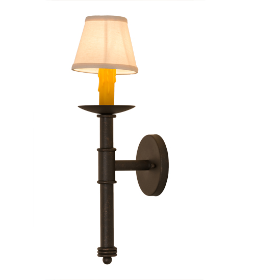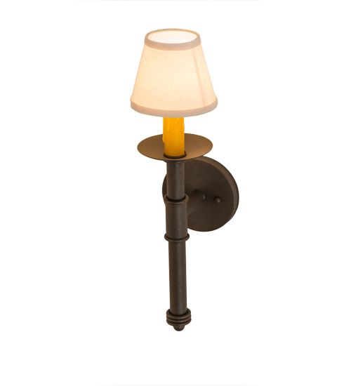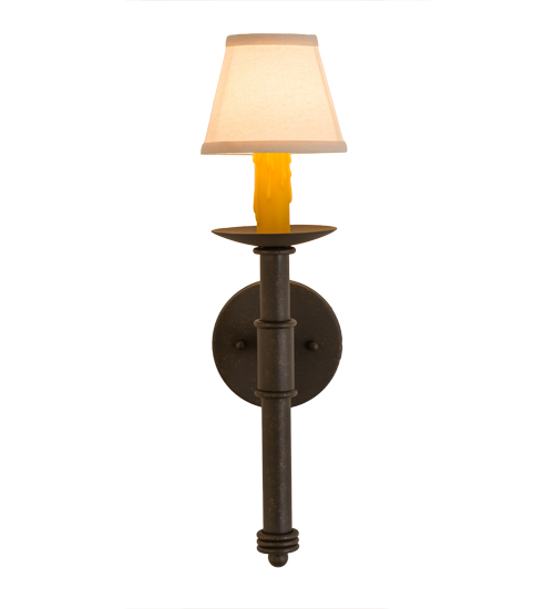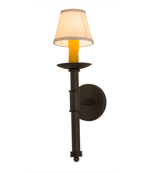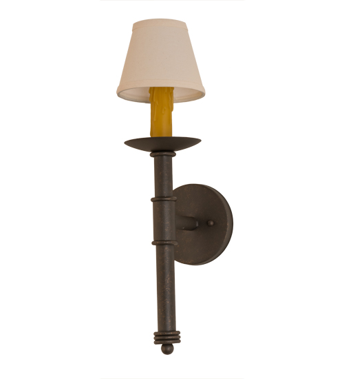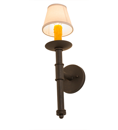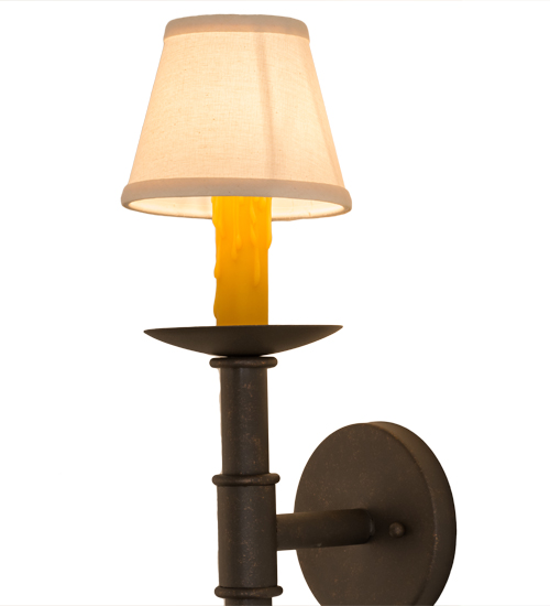 Designed as a dramatic accent piece for any room or corridor, this wall sconce features a Natural Linen Textrene shade perched on a faux candlelight and bobeche with telescopic styled accents. This fixture offers decorative hardware in a Gilded Tobacco finish. Handcrafted by the highly skilled hands of artisans in our 180,000 square foot manufacturing facility in Yorkville, New York. Custom colors, styles and sizes are available, as well as dimmable, energy efficient lamping options. UL and cUL listed for damp and dry locations.