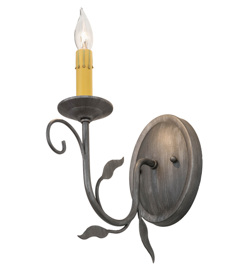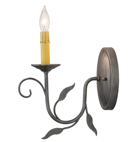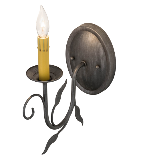 Offering luxurious charm and elegance, Bordeaux features a single light with a steel arm in a stunning Iron Ore finish, complemented with matching leaves, scroll design and a graceful faux Amber candlelight. The candlelight is perched on a bobeche attached to the gracefully designed arm and round backplate. Custom crafted in the USA, this sconce is available in custom sizes, styles and colors, as well as dimmable energy efficient lamping options. This wall fixture is UL and cUL listed for damp and dry locations.