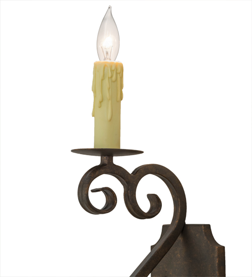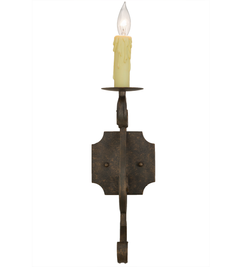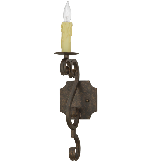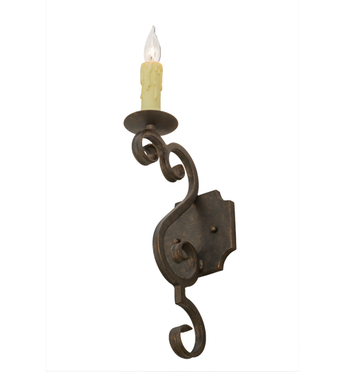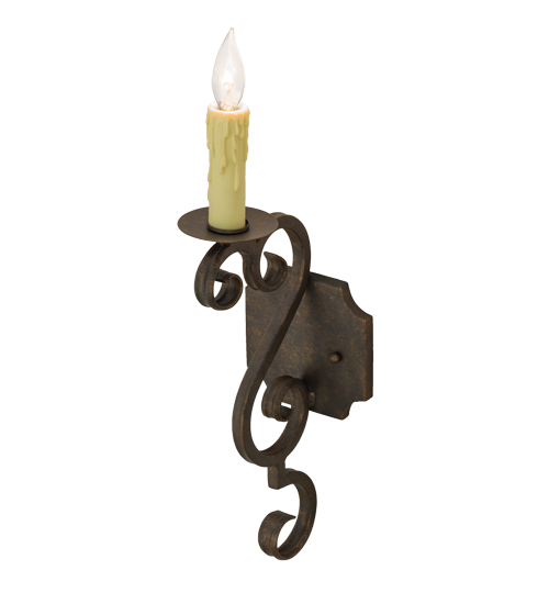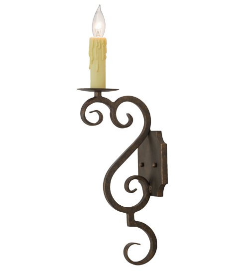 Exquisite minimalism blends with stunning Gothic Revivalism. This single Ivory faux candlelight is perched on a bobeche embraced by a Hand-Forged Iron Scrolled arm in a Gilded Tobacco finish. Custom crafted by highly skilled artisans in our 180,000 square foot manufacturing facility in Yorkville, New York. Candlelight colors, metal finishes and fixture sizes can be customized. UL and cUL listed for dry and damp locations.