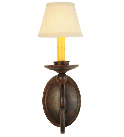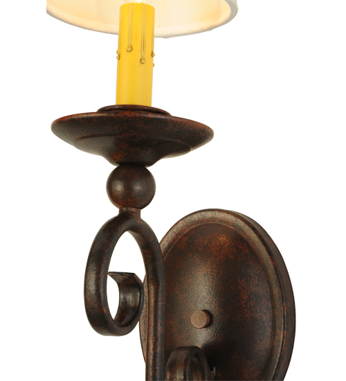 Romantic charm and elegance come to light with the Wallis wall sconce, which features an Amber faux candlelight topped with a White Textrene shade perched on a bobeche which is attached to scroll designed arms. The hand forged hardware, frame and accents are highlighted in a Cajun Spice finish. Handcrafted by highly skilled artisans in our Upstate New York manufacturing facility, this fixture is available in custom sizes, styles, colors and energy efficient lamping options such as LED. This sconce is UL and cUL listed for damp and dry locations.