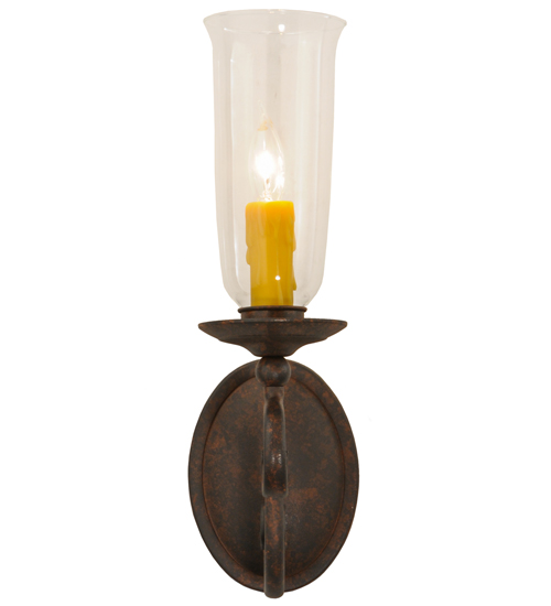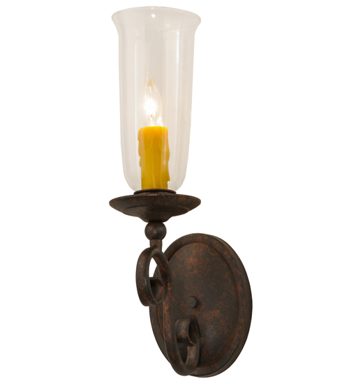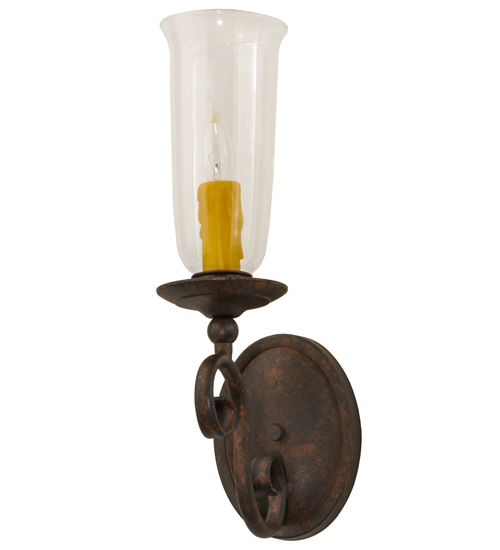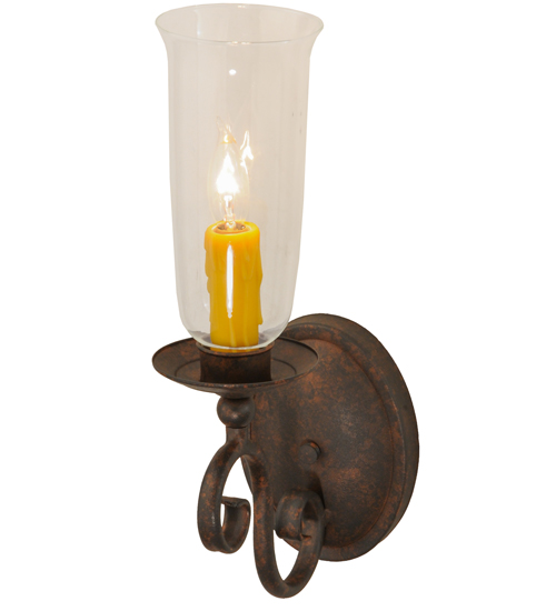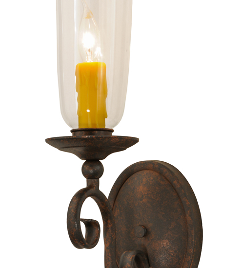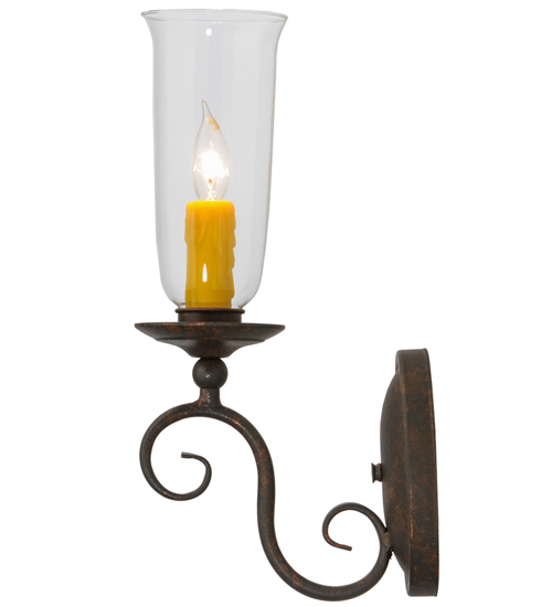 Romantic charm and elegance come to light with the Wallis wall sconce, which features a Clear Glass Hurricane shade that reveals an Amber faux candlelight perched on bobeches attached to scroll designed arms. The hand forged hardware, frame and accents are highlighted in a Cajun Spice finish. Handcrafted by highly skilled artisans in our Upstate New York manufacturing facility, this fixture is available in custom sizes, styles, colors and energy efficient lamping options such as LED. This sconce is UL and cUL listed for damp and dry locations.