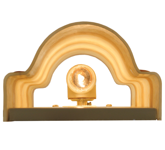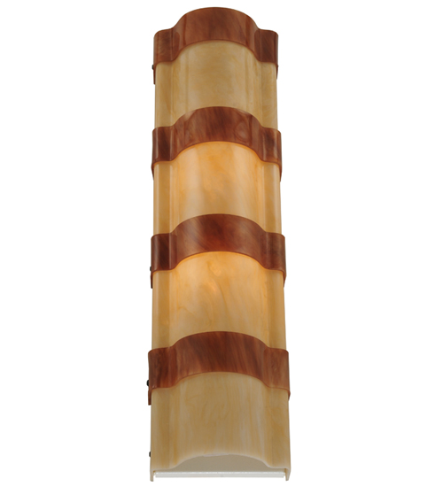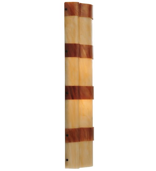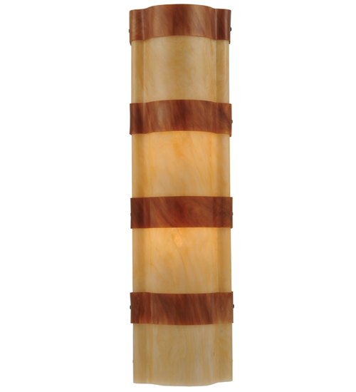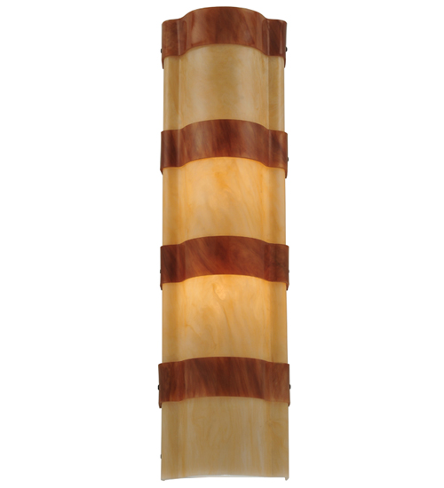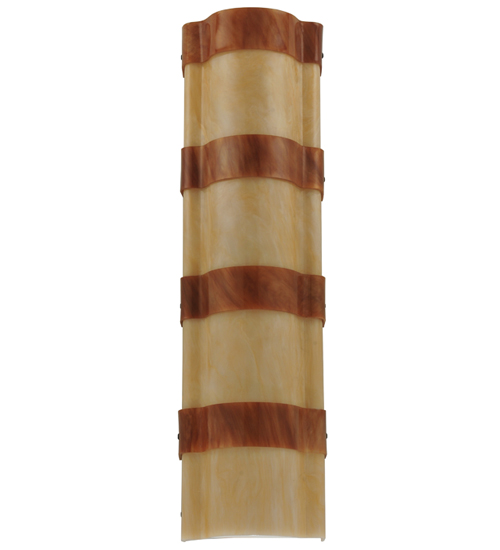 Impeccable interior decor fashion comes to light. A melange of warm colors of Sahara Taupe Idalight and textured designs are revealed with bands of Ambra Siena Idalight. This custom wall sconce, nearly 24 inches in height, is created by the hands of skilled artisans at its manufacturing facility in Upstate New York in the USA. Custom sizes, styles and colors are available, as well as dimmable, energy efficient lamping options such as LED. The curved wall fixture is UL and cUL listed for damp and dry locations.