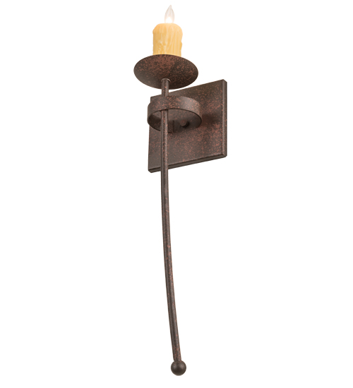 Handsome styling greets a distinctive sophisticated look. An Ivory faux candlelight is perched atop of a custom tailored bobeche accented with a long slender decorative stem embellished with a ball tip for a high level of aesthetic appeal. An appealing square backplate is complemented with a curved band. Stunning solid hardware is hand forged and hand finished in a Rusty Nail hue. Ideal for hallways, foyers and other spaces in homes, restaurants, pubs, hotels and other fine interiors. The fixture is custom crafted by artisans in our 180,000 square foot manufacturing facility in Yorkville, New York. UL & cUL listed for dry and damp locations.