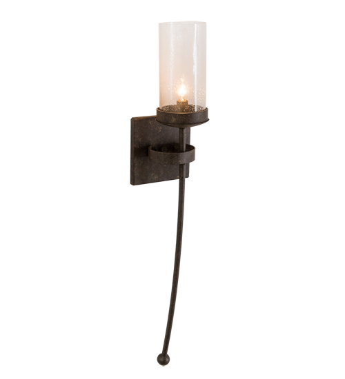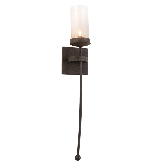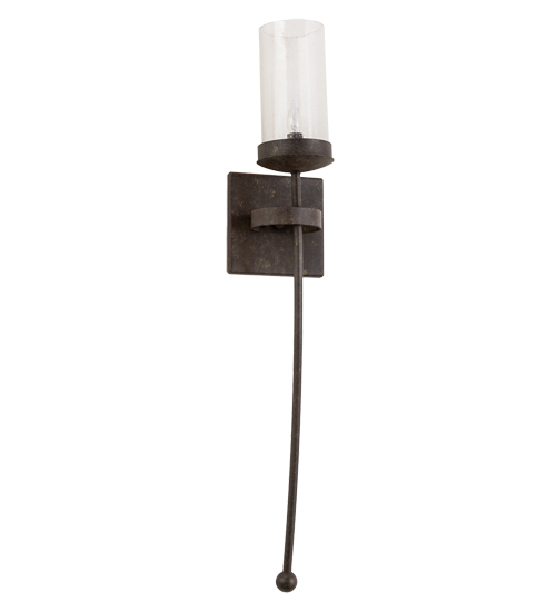 Handsome styling greets a distinctive sophisticated look. A Clear Seeded Glass Cylinder is perched atop of a custom tailored bobeche accented with a long slender decorative stem embellished with a ball tip for a high level of aesthetic appeal. An appealing square backplate is complemented with a curved band. Stunning solid hardware is Hand Forged and hand finished in an Antiquity hue. Ideal for hallways, foyers and other spaces in homes, restaurants, pubs, hotels and other fine interiors. The fixture is custom crafted by artisans in our 180,000 square foot manufacturing facility in Yorkville, New York. UL & cUL listed for dry and damp locations.