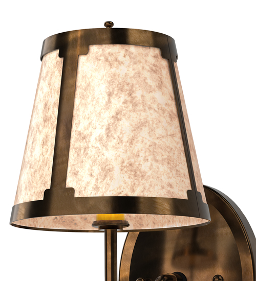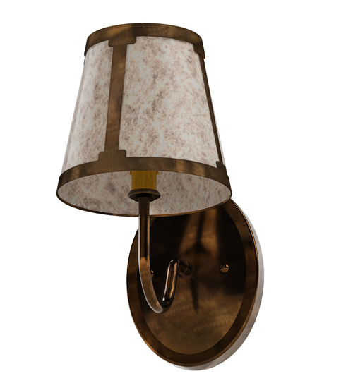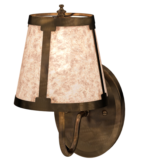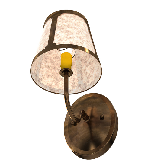 You can elevate your space with this stunning curvaceous wall sconce. Talmont features a sleek Silver Mica shade, which is perched on an Ivory faux candlelight. The wall fixture is enhanced with a curved arm and a round backplate featured in an Antique Copper finish. The mica shade offers a classic, tapered design that renders a handsome look and beautiful ambient illumination. This wall luminaire is ideal for use in hallways, dining areas, and living spaces in residential and hospitality settings. The Talmont Wall Sconce is included in our American-made, American-designed, handcrafted Transitional Lighting Collection and is manufactured in Yorkville, New York. UL and cUL listed for dry and damp locations.