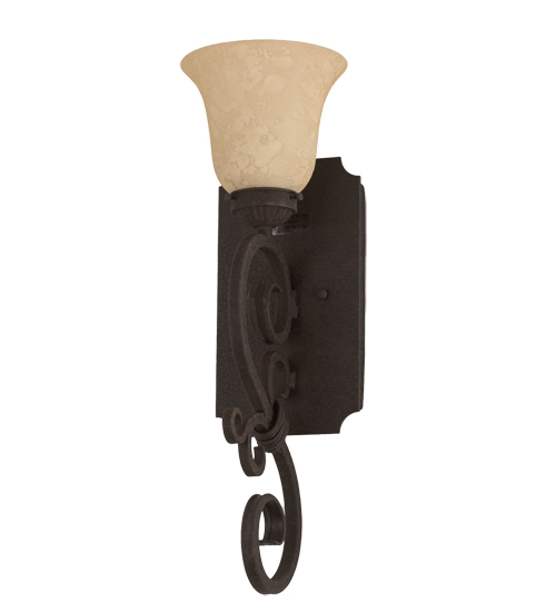 Exquisite minimalism blends with a distinctive revivalism as a mellow glow is cast from this bell shaped, Scavo Bell art glass shade. The Thierry wall sconce is adorned with a Hand-Forged Iron scroll-like arm and hardware featured in an authentic Distressed Chestnut finish. Handcrafted by highly skilled artisans in our 180,000 square foot manufacturing facility in Yorkville, NY. Available in custom sizes and finishes. UL and cUL listed for dry and damp locations.