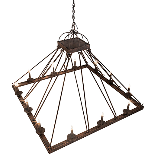 Modern geometry melds with the romantic ambient look of candlelight. 12 Complementary faux candlelights project beautiful ambient illumination and are complemented with a Distressed Chestnut finish. Fully adjustable and customizable, the overall height of the pendant can be changed from 47 to 82 inches on site to meet your lighting needs. Faux candlelight colors, metal finishes and chandelier sizes can be customized to satisfy your taste. UL and cUL listed for dry and damp locations.