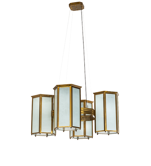 Utilizing a blend of old-world craftsmanship and modern technology… Affeton brings home unsurpassed quality and appeal. Ambient light is diffused through four lanterns featuring Frosted Fluted Glass panels. The shades are complemented by Transparent Gold finished hardware. This massive fixture is ideal for illuminating dining rooms and entryways in homes and hotels from Lowell, Massachusetts, to High Point, North Carolina, to Pueblo, Colorado. The overall height ranges from 34 to 96 inches, as the aircraft cable can be easily adjusted in the field. The Affeton 4 Light Pendant is included in the American-made, American-designed, handcrafted Inspirational Lighting Collection. UL and cUL listed for dry and damp locations. The lighting fixture was designed by MB Within Interior Design of Charleston, South Carolina and featured in the Marble and Fin restaurant in Charleston, South Carolina.