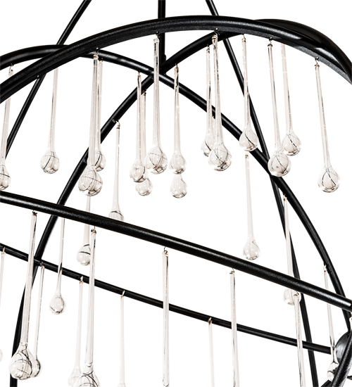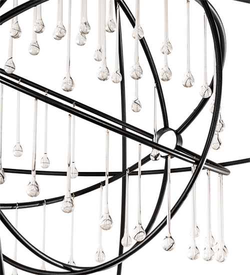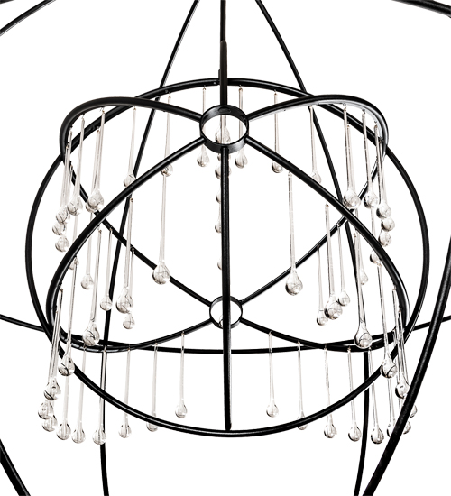 Like a complex gyroscopic structure. Solid metal rings create a unique curvature pattern that evokes the illusion of revolutionary motion like a spinning gimbal rotating on its axis. The orbed frame envelopes a smaller frame similar to one that represents atomic energy. This indoor/outdoor decorative sculpture features a Textured Black finish treated for exterior applications. The sculpture is adorned with exquisite Crystal teardrop accents. The overall height ranges from 67 to 186 inches as the chain length can be easily adjusted in the field to accommodate your specific lighting needs. Crystal options, metal finishes and fixture sizes can be customized to your needs. This fixture does not illuminate but various lamping can be added to light as a chandelier.