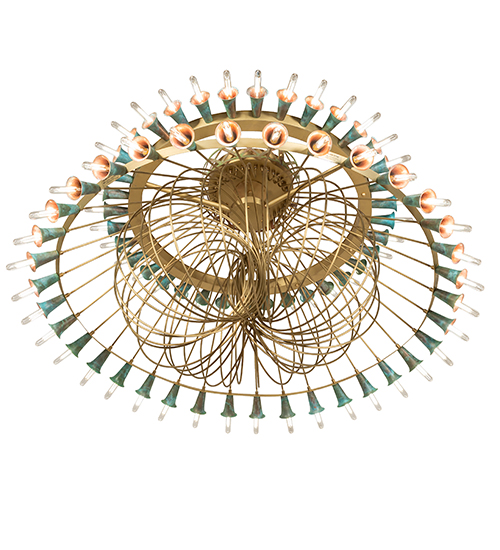 A magnificent, massive masterpiece of Brass, Copper, and energy-efficient LEDs that speaks to drama, excitement, and celebration of beautiful lighting and design. Spring into action and select this innovative two-tier lighting design, which features organically bent Brass Tubing finished in Brushed Brass. Beautiful Verdigris Copper finished socket cups, designed as Trumpet Lily flowers, pair beautifully with 72 customer-supplied lamps. This eye-catching ceiling fixture is ideal for illuminating entryways, lobbies, and ballrooms in hotels and other commercial lighting installations. The decorative canopy and banding accents are crafted of Copper. The Coyle 72 Light Semi-Flushmount is featured in our American-made, American-designed Coyle Chandelier Collection, which is manufactured in Yorkville, New York. UL and cUL listed for dry and damp locations.