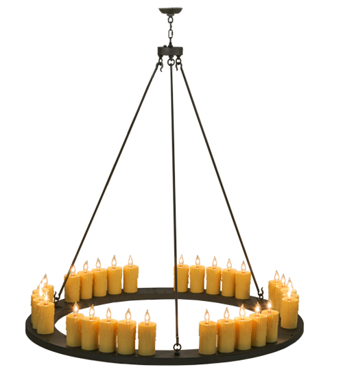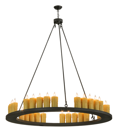 As if it was forged of iron during the Middle Ages and hung from the ceiling of a mighty stone castle, the Loxley chandelier features a ring suspended by rods and tipped with 30 Ivory faux candlelight columns. This rustic fixture is featured in a Wrought Iron finish. Handcrafted by highly skilled artisans in our 180,000 manufacturing facility in Yorkville, New York. This fixture is available in custom sizes, styles, and colors. Dimmable energy efficient lamping option options such as LED are available. UL and cUL listed for damp and dry locations.