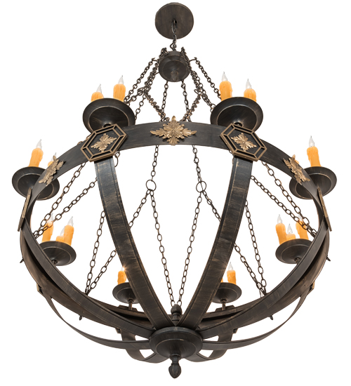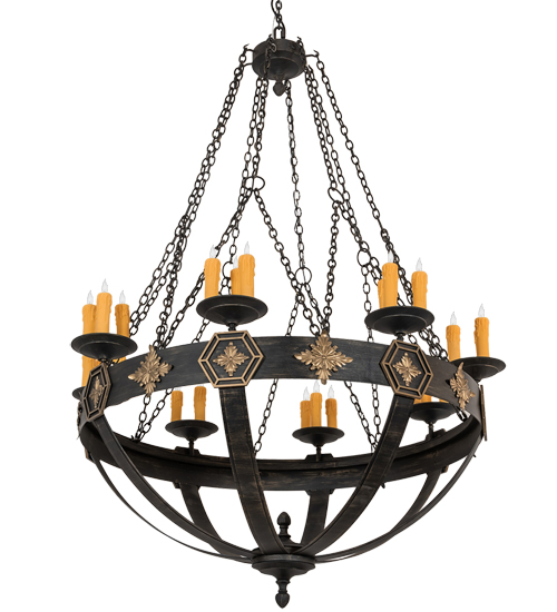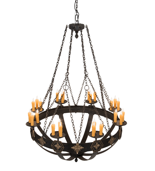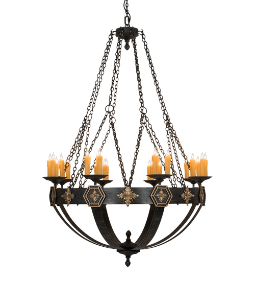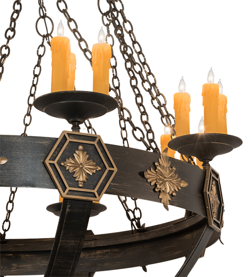 A sturdy ring with medallions in a Textured Black with Soft Gold Highlights finish serves as the centerpiece of this stunning chandelier. 24 Ivory faux candlelights illuminate while embraced by bobeches attached to this sturdy ring. The overall height ranges from 86 to 205 inches as the chain length can be easily adjusted in the field to accommodate your specific lighting application needs. Highly skilled artisans utilize multiple hand forging techniques to apply a variety of handsome metal textures for a unique look. Custom crafted in our 180,000 square foot manufacturing facility in Yorkville, New York. Special sizes, styles and colors are available. UL and cUL listed for dry and damp locations.