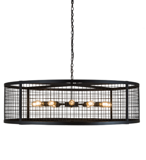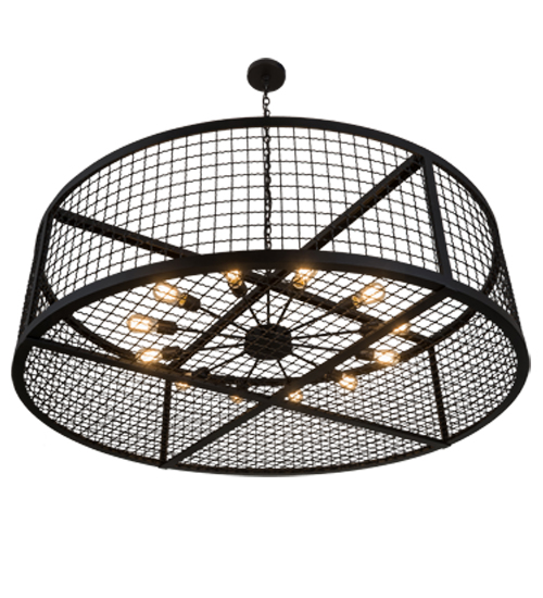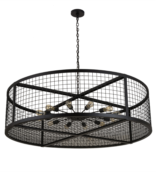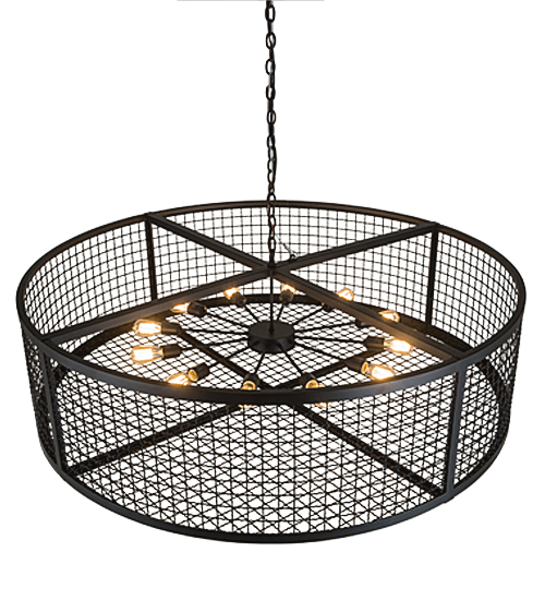 Discover a unique decorative look and industrial lighting design featuring a Grand styled caged frame that reveals a sprocket styled configuration with 12 Customer-supplied, Medium base Edison styled lamps from within. Paloma Golpe offers solid hardware and frame featured in a bold Textured Black finish. The 5-foot wide fixture is ideal for illuminating entryways, lobbies and large residential, hotel, restaurant and other commercial spaces. Handcrafted by highly skilled artisans in the USA, this fixture is offered in a myriad of custom lamping options including LED, as well as sizes, designs and finishes. The striking pendant is UL and cUL listed for damp and dry locations.