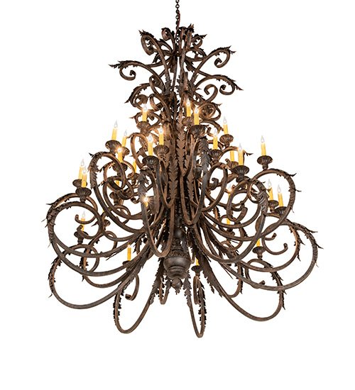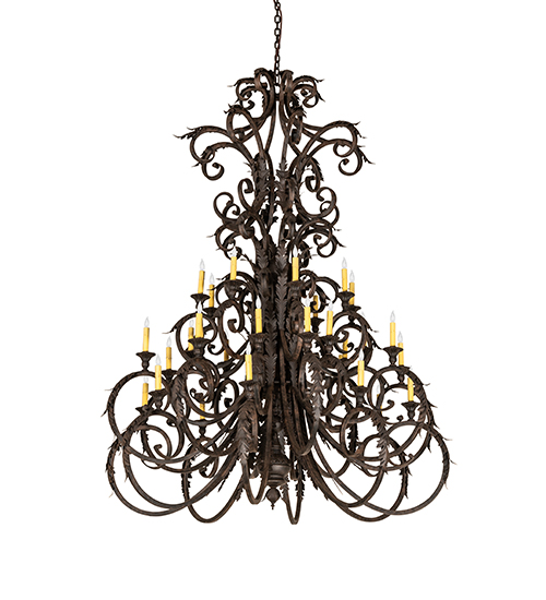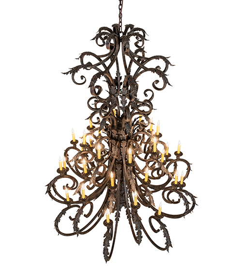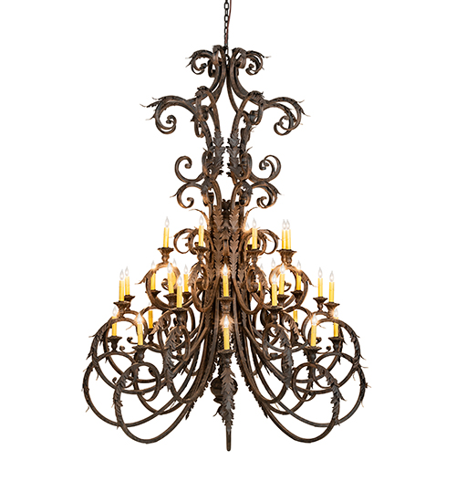 Weighing in at over 200 pounds, this heavy wrought iron, large-scale chandelier defines elegance, grace, and beauty. The fixture features shapely curves in exquisite Coffee Bean and Cajun Spice finishes. Serratina offers a lustrous symphony of Hand-Forged Iron Scrollwork, Crystal Pendalogs and Garlands, accented with metal Acanthus Leaves throughout. Thirty-two delicate Ivory faux candlelights create beautiful ambient illumination. The overall height of this pendant ranges from 75 to 174 inches, as the chain length can be easily adjusted in the field to accommodate your specific lighting application needs. The Serratina 32 Light Chandelier is featured in our American-made, American-designed, handcrafted Transitional Lighting Collection, which is manufactured in Yorkville, New York. The fixture is UL & cUL listed for dry and damp locations.