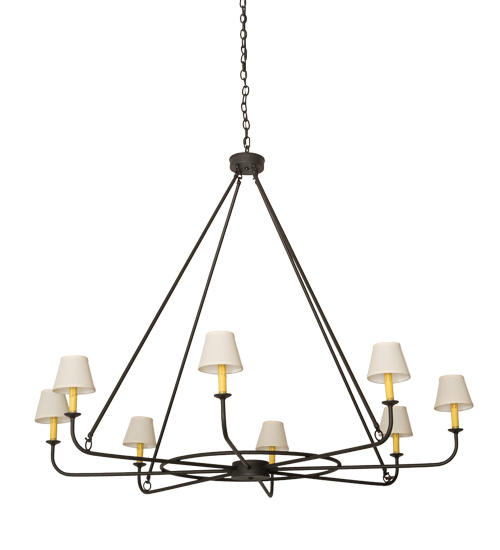 An exquisite articulation of beautiful ambient lighting and graceful design, the Brach Ring chandelier features a stunning centerpiece with 8 curved arms branching out with Ivory faux candlelights crowned with Ivory Textrene shades perched atop of custom tailored bobeches. The chandelier is highlighted with stunning Hand-forged Iron hardware is hand finished in a Wrought Iron hue. Ideal for lobbies, foyers and other spaces in homes, restaurants, hotels and other fine interiors, the fixture is custom crafted by highly skilled artisans in our manufacturing facility in Yorkville, New York. Custom sizes, designs, colors and dimmable energy efficient lamping options are available. The 60-inch wide chandelier is UL and cUL listed for damp and dry locations we do not recommend installing it in spaces that experience a large amount of moisture.