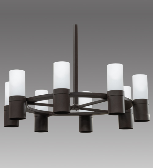 Designed with sophisticated architectural styling, this distinctive lighting centerpiece will enhance both formal and casual interior settings. 6 Statuario Idalight Cylindres, each with a customer-supplied, medium base lamp for ambient uplighting and another for functional downlighting, embrace the round crosshatch frame in a warm Cafe Noir finish. Perfect for lobbies, conference rooms, foyers and large spaces, the chandelier is handcrafted in our 180,000 square foot manufacturing facility in Yorkville, New York. Custom styles, colors, sizes and dimmable energy efficient lamping options such as LED are available. UL and cUL listed for damp and dry locations.