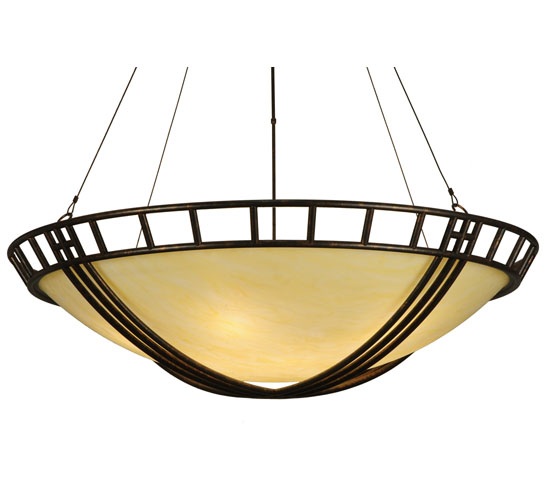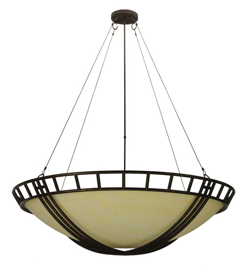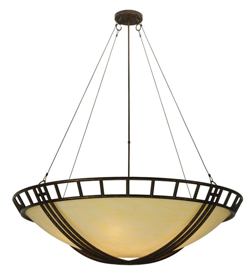 A metallic hammock-inspired frame cradles an inverted Provostone Idalight bowl shaped diffuser which is trimmed with a geometric border. The decorative frame, accents and hardware are featured in a Coffee Rust finish while the shade is embraced by unobtrusive aircraft cables. The 5-foot wide pendant is handmade by highly skilled artisans in our manufacturing facility in Yorkville, NY. This fixture is offered in custom sizes, styles and finishes. Dimmable energy efficient lamping options such as LED are available. UL and cUL listed for dry and damp locations.