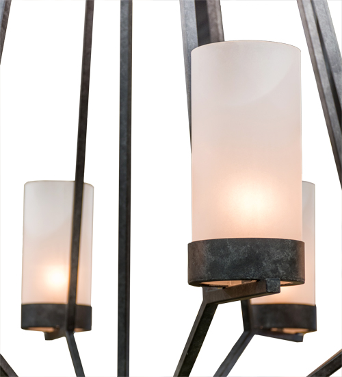 An openwork structure, featuring an elaborate frame custom built of Solid Steel, is adorned with 12 White acrylic cylindrical accents that illuminate from this unique pendant’s arms. The hardware is featured in a Smoke finish and custom crafted in the USA. Custom colors, styles, sizes and dimmable energy efficient lamping options are available.