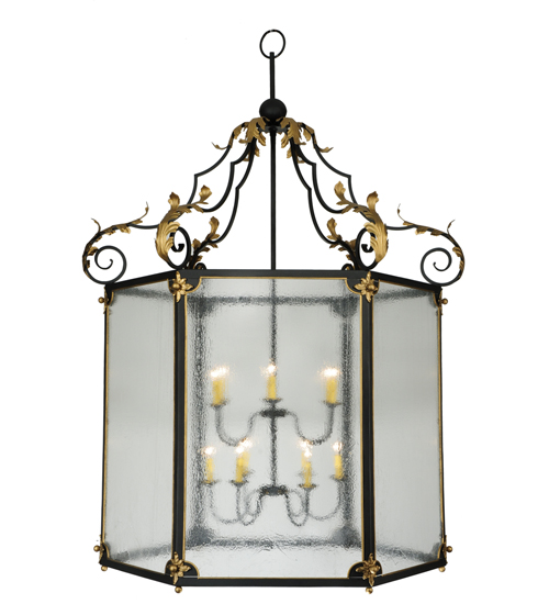 Utilizing a blend of old world craftsmanship and 21st century technology, the Ganser Lantern brings home unsurpassed quality and appeal. Evoking a dramatic effect, ambient light is diffused through Clear Seeded glass which reveals a 2-tiered Faux Amber Candelabra for beautiful ambient illumination. The shade is complemented with an appealing frame featured in a Black finish and adorned with Acanthus leaves and other accents in a Gold Leaf finish. The hexagon shaped fixture is handcrafted by highly skilled artisans in our factory in Upstate New York Custom options include various sizes, colors, designs and dimmable energy efficient lamping options. The 60-inch wide pendant is UL and cUL listed for dry and damp locations.