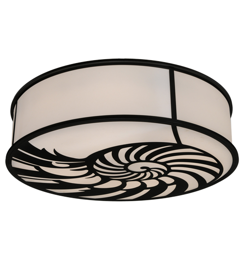 An alluring Nautilus shell is depicted in a magnificent abstract design on the diffuser of this sea inspired ceiling fixture. This distinctive shade is hand crafted with enticing Statuario Idalight panels and complemented with accents and hardware featured in a stunning Black Textured finish. Hand crafted by artisans in the Yorkville, New York manufacturing facility. Custom colors, designs and sizes offered. Energy efficient lamping available. UL and cUL listed for damp and dry locations.