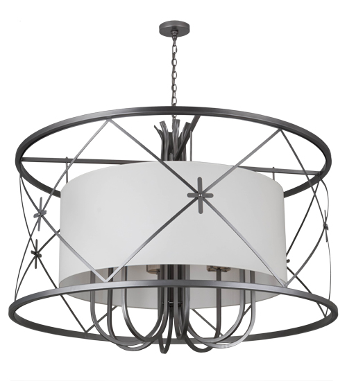 American craftsmanship creates the beauty of fine lighting with this elegant Penelope pendant. A circular frame embraces a stunning White Linen Textrene shade that envelopes Fleshtone Idalight and conceals 8 customer-supplied A19 60-watt lamps. The decorative steel arms, along with the diamond and cross designed accents, are hand finished in a handsome Nickel powdercoat. The result is a unique pendant-in-a-pendant style. Custom sizes, designs and colors are available, as well as dimmable energy efficient lamping options such as LED. The fixture is UL and cUL listed for damp and dry locations.