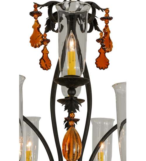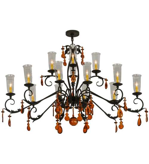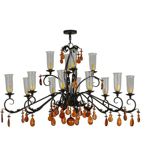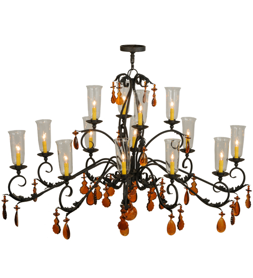 Inspired by the beauty and grace of ballrooms in renowned castles and mansions spanning the globe, Windsor features 14 Clear Glass Hurricane styled shades that reveal Ivory faux candle lights. The elegant shades are embraced with bobeches with Acanthus Leaf Accents and Amber Crystal Orb and Pendalogs on a frame with hardware featured in a Chestnut Textured finish. The overall height ranges from 43 to 150 inches as the chain length can be easily adjusted in the field to accommodate your specific lighting application needs. Handcrafted by highly skilled artisans in our 180,000 square foot manufacturing facility. Available in a wide range of custom choices including various finishes and sizes. UL and cUL listed for dry and damp locations.