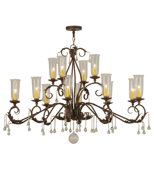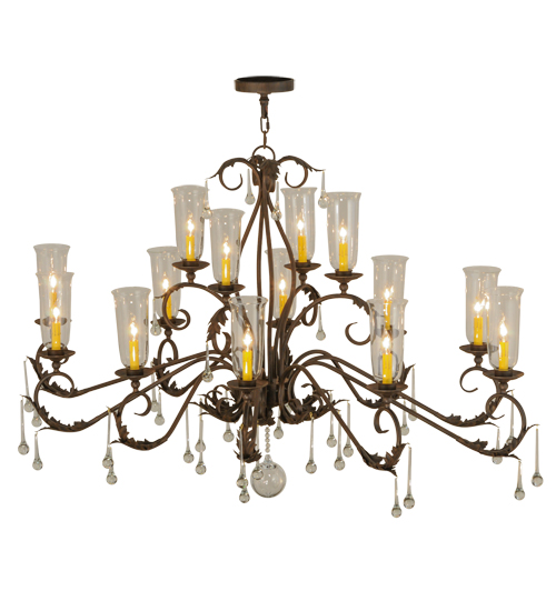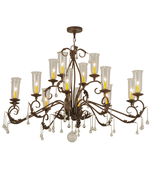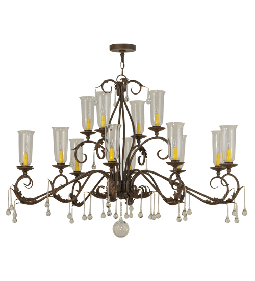 Inspired by the beauty and grace of ballrooms in renowned castles and mansions spanning the globe, Windsor features 14 Clear Glass Hurricane styled shades that reveal Ivory faux candle lights. The elegant shades are embraced by bobeches with Acanthus Leaf Accents and Teardrop Crystals and Orb on a frame with hardware featured in a Classic Rust finish. The overall height of this chandelier ranges from 44 to 103 inches as the chain length can be easily adjusted in the field to accommodate your specific lighting application needs. Handcrafted in our 180,000 square foot manufacturing facility in the USA, this fixture is available in custom sizes, styles, and colors, as well as dimmable energy efficient lamping options. UL and cUL listed for damp and dry locations.