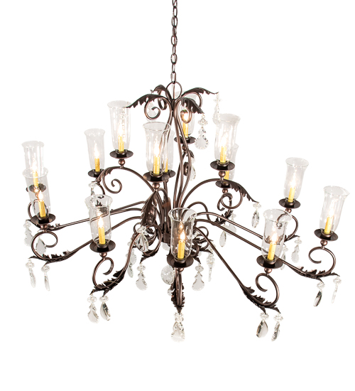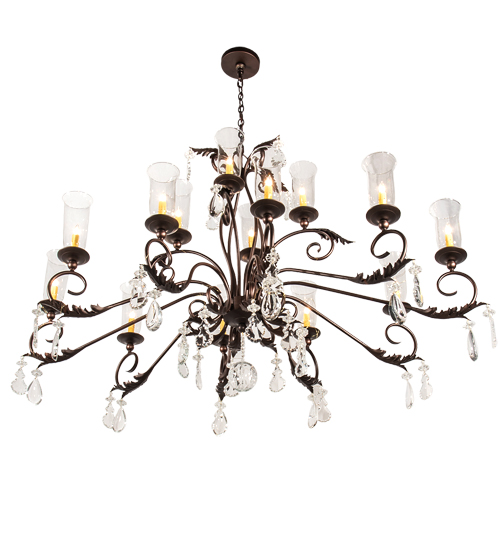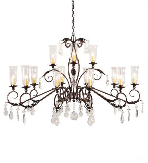 Inspired by the beauty and grace of ballrooms in renowned castles and mansions spanning the globe. Windsor features 14 Clear Glass Hurricane styled shades that reveal Ivory faux candlelights. The elegant shades are embraced with bobeches featuring Acanthus Leaf scrolled accents and Crystal Orb and Pendalogs on a frame with hardware featured in a Mahogany Bronze finish. The overall height of this chandelier ranges from 43 to 115 inches as the chain length can be easily adjusted in the field to accommodate your specific lighting application needs. Handcrafted in our 180,000 square foot manufacturing facility in the USA. Available in custom sizes and finishes. UL and cUL listed for damp and dry locations.