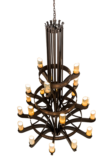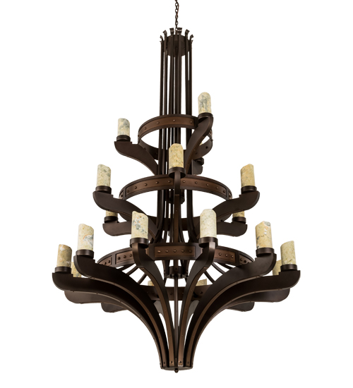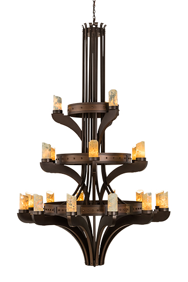 Stunning and enchanting, rich charm and grand styled elegance come to light with the Castilla chandelier, a dramatic centerpiece for foyers, ballrooms, lobbies and other large spaces in residential, hospitality and commercial settings. The 3-tier fixture features 21 thinly hand carved and polished Natural Jadestone Cylindres in Earthy tones which become luminescent. Hand-forged Iron hardware and ballpoint studs are featured in 2 complementary Mahogany Bronze finishes. The overall height of this pendant ranges from 109 to 228 inches as the chain length can be easily adjusted in the field to accommodate your specific application needs. Handcrafted in our 180,000 square foot manufacturing facility in Yorkville, NY.