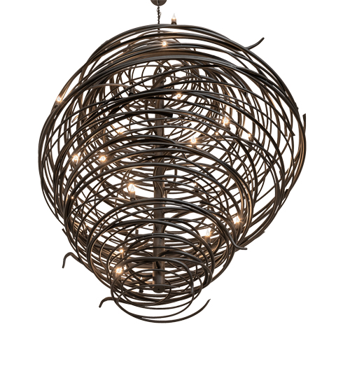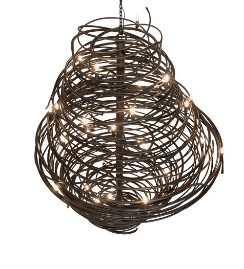 The large, bold, eye-catching Cyclone simulates whirling winds of energy and gyration with Hand-forged Old Wrought Iron that is accentuated with 36 delicately placed, energy-efficient LED beacons to help you weather the storm. The winding mass of metal surrounds a sturdy post. Overall height ranges from 92 to 163 inches as the chain easily adjusts in the field. Make an impressive design statement that will Wow guests in lobbies, conference rooms, entryways, and other residential and commercial spaces. The Cyclone Chandelier is included in our American-made, American-designed, handcrafted Cyclone Collection. Manufactured in Yorkville, New York. UL and cUL listed for dry and damp locations.