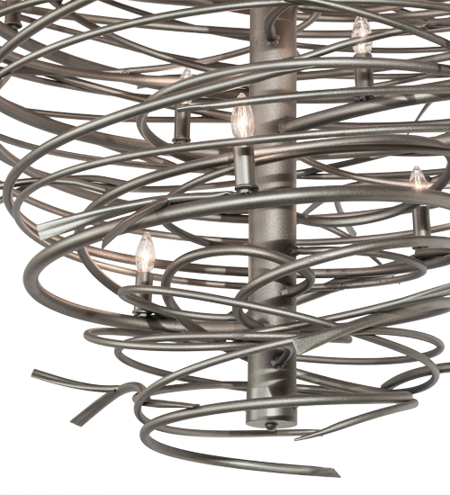 The bold, eye-catching Cyclone simulates whirling winds of energy and gyration with twisting steel that is accentuated with 36 delicately placed beacons to help you weather the storm. The winding mass of steel surrounds a sturdy post, all featured in our Pewter finish. Make an impressive design statement that will wow guests in lobbies, conference rooms, entryways and other residential and commercial spaces. The fixture is handcrafted by master artisans in our 180,000 square foot manufacturing facility in Yorkville, New York. Custom designs, styles, sizes and dimmable energy efficient lamping such as LEDs are available. This chandelier is UL and cUL listed for damp and dry locations.