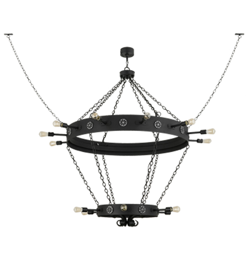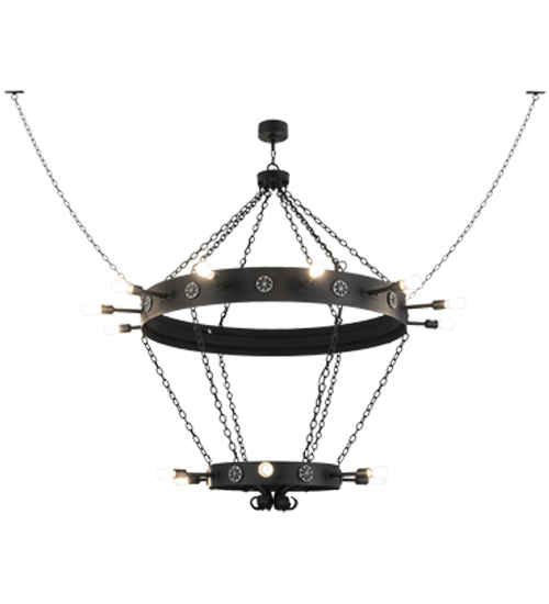 Old world styling is perfected into this unique Solid Steel chandelier suspended with Black chains at various levels. Striking Black finished bands are adorned with Silver highlighted medallions while 18 traditional lamps project ambient light from the perimeters. All of the hardware, including the scroll like accents on the bottom, are complemented in a Black finish. Handcrafted in the facility in the USA, this fixture is available in custom sizes, styles, colors and dimmable energy efficient lamping options.
